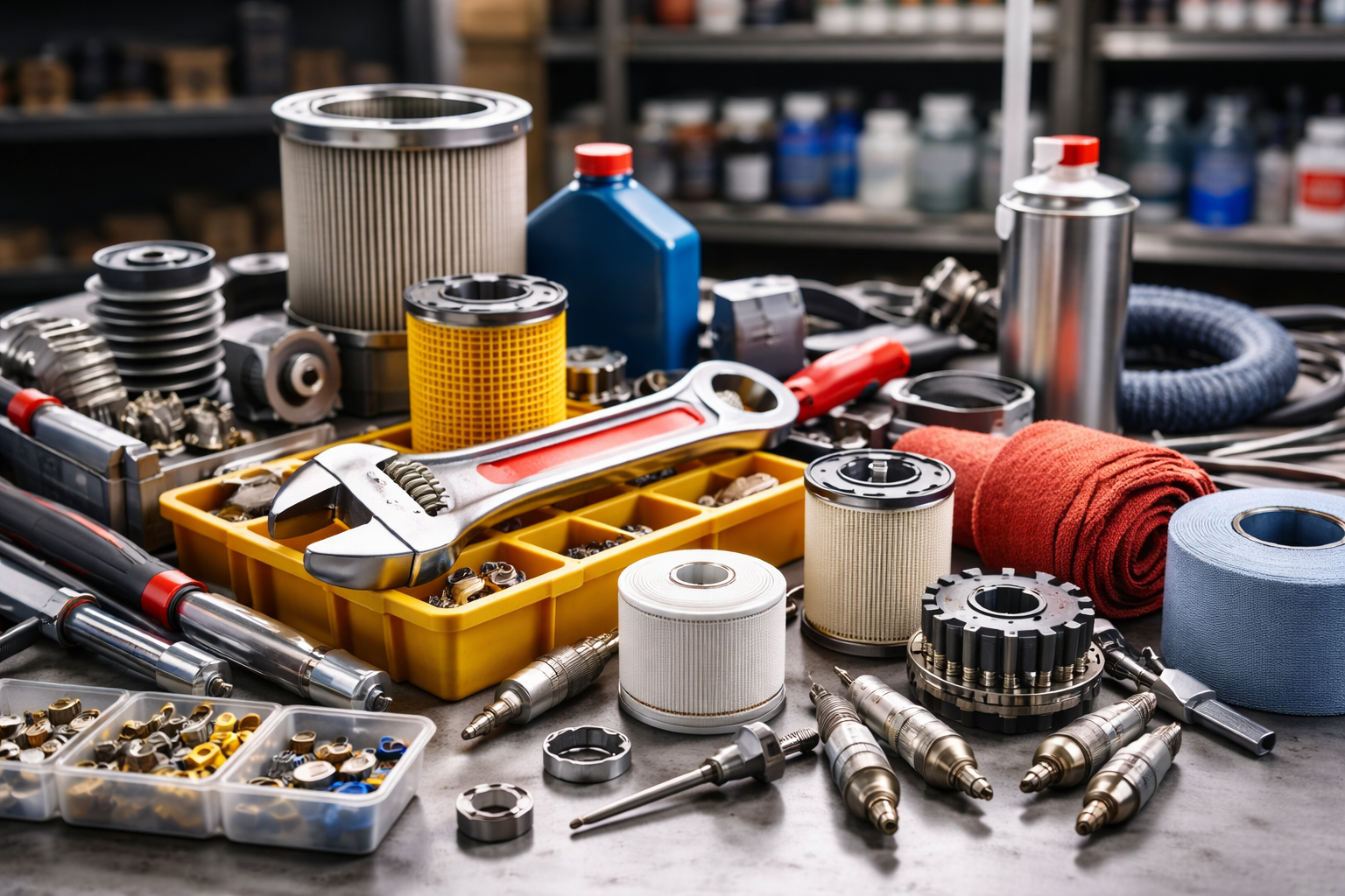 Filter, bearing, seal kit, grease, dan spare part perawatan rutin untuk memperpanjang usia pakai alat berat.