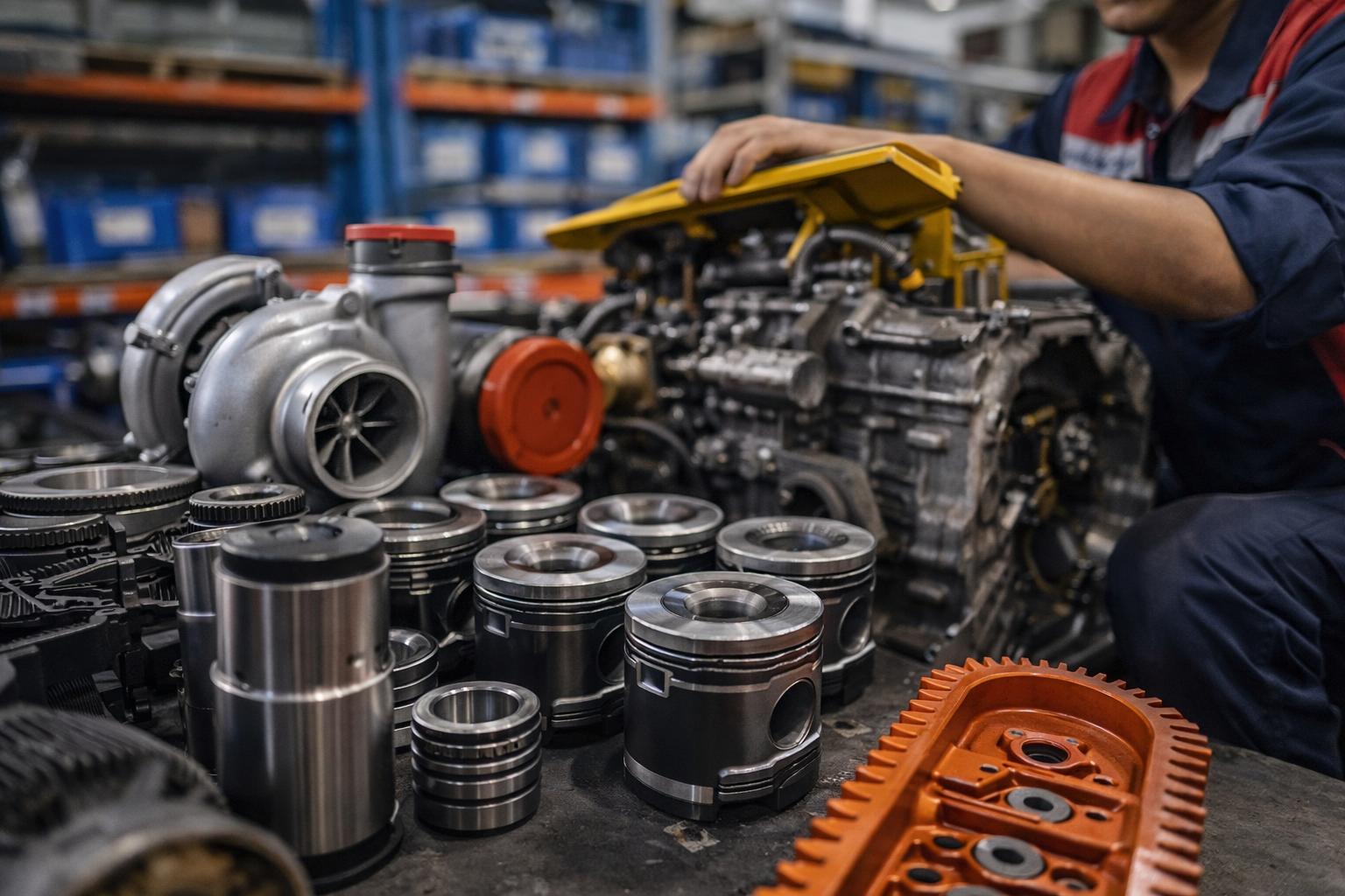 Menyediakan komponen mesin dan sistem penggerak seperti piston, turbocharger, crankshaft, dan gearbox untuk menjaga performa serta daya tahan alat berat.